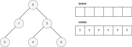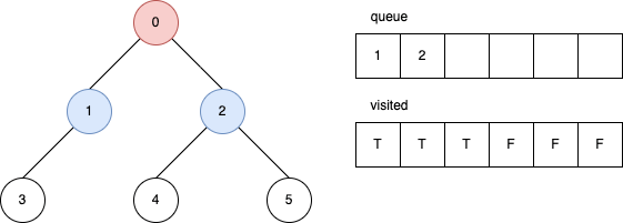 BFS 演算法需要兩個資料結構。一個叫 visited,用來記錄點是否已經探索過,而另外一個是 queue。當探索到某個點時,它會將相鄰點一一加入到 queue 裡。然後,每一次都會從 queue 中取出最先加入的點來探索。